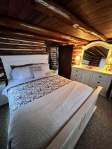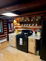 The dining area seats six, and the country-style kitchen accommodates two guests, both rooms overlooking the rushing creek. Equipped with full-size appliances, the kitchen makes meal preparation easy and enjoyable. Step outside onto the 40-foot concrete patio, which overlooks a half-acre lawn and the creek—perfect for outdoor entertaining. The patio includes a wood-burning outdoor fireplace, a gas grill, and seating for six, ideal for meals or relaxing evenings under the stars.