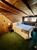The cabin comfortably sleeps six guests across three bedrooms—with queen beds—making it ideal for families or groups. The expansive great room features beautiful log accents, soaring ceilings, and a cozy gas fireplace, creating a warm and inviting atmosphere. An oversized leather sectional provides ample seating for everyone, while the upstairs loft overlooks the main living space, offering an additional relaxing area.